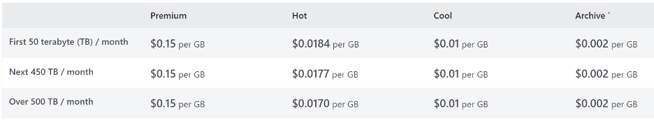 The following examples use the East US 2 Azure region’s prices for LRS blob storage in USD. In them, we can see significant storage cost savings with Archive versus Cool and Hot, as follows: